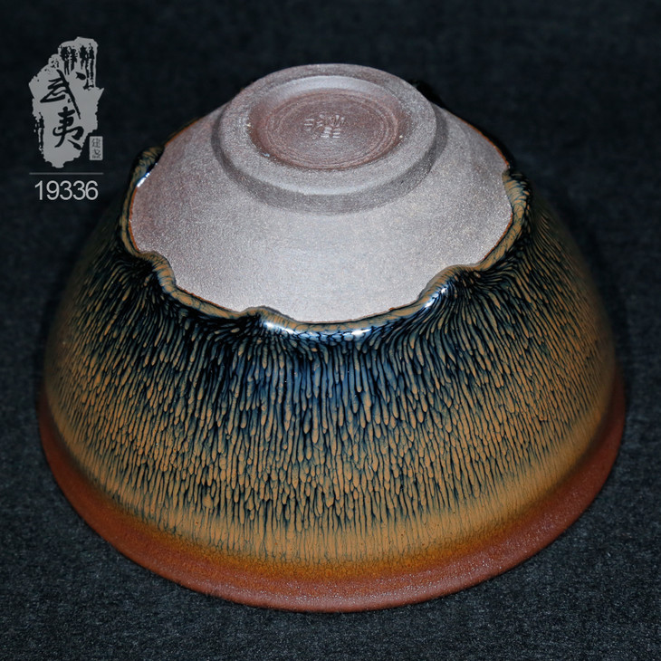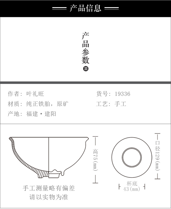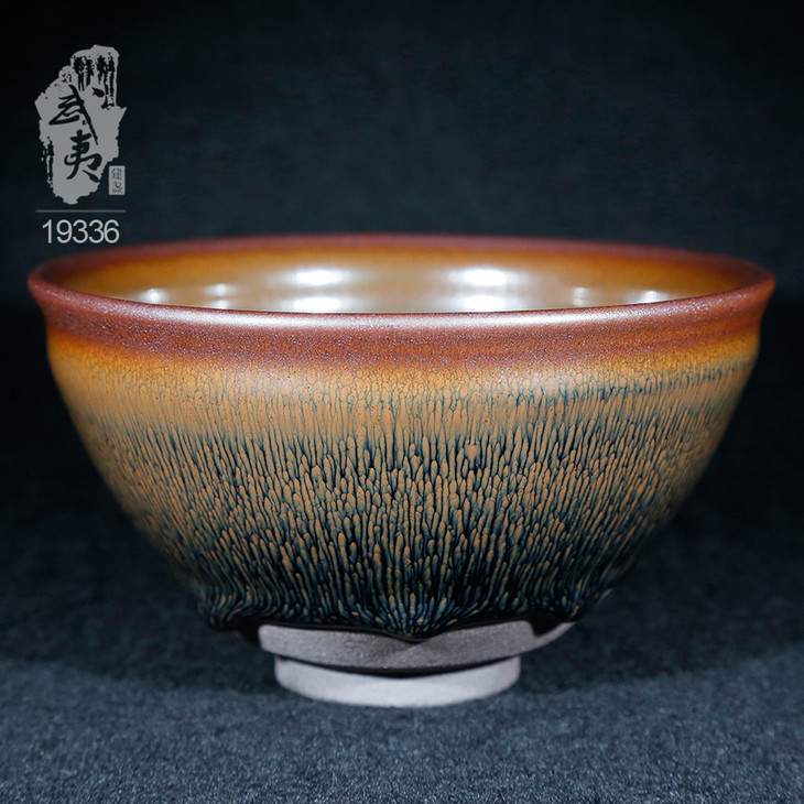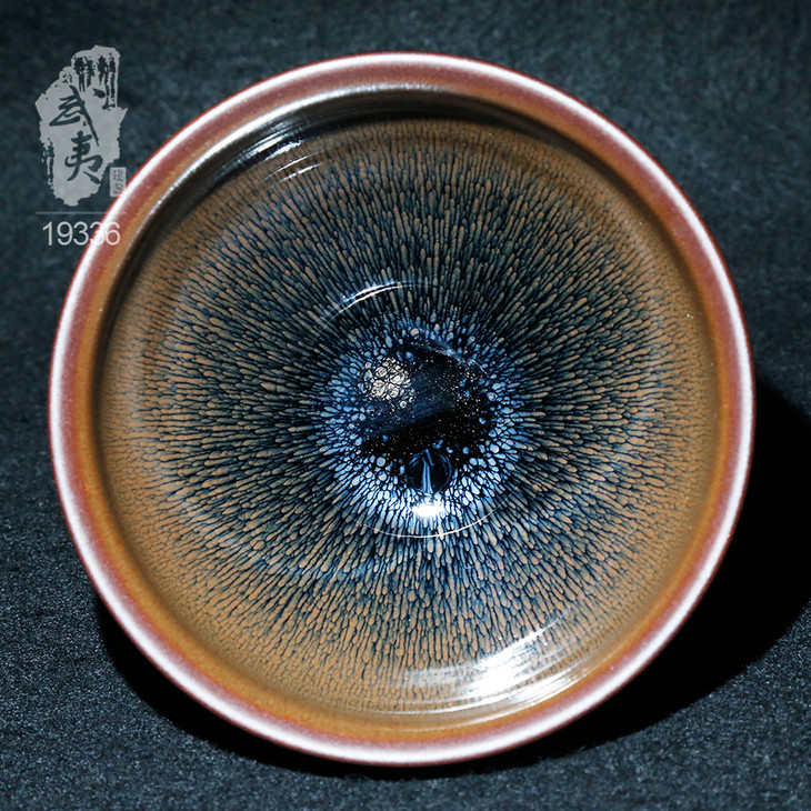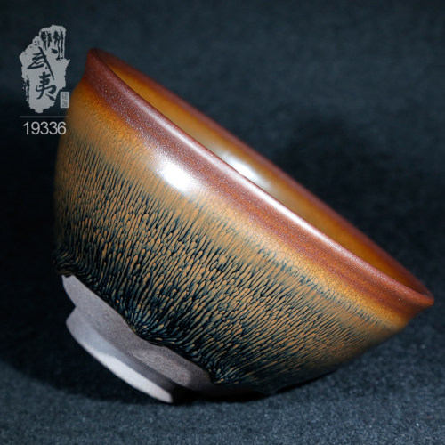 叶礼旺专注兔毫盏技艺研究多年,传承宋代生胚上釉、地方原矿釉和草木灰配釉的传统工艺。烧制的兔毫盏胎土纯正,釉色温润,器型优雅,兔毫斑纹清晰密布,丝丝相连,尤其擅长大盏的制作。古法技艺下产出的兔毫盏,毫丝立体,铁胎独特,干口有度,与宋代兔毫盏极为相似,曾被授予“优秀宋盏制作人”的称号。