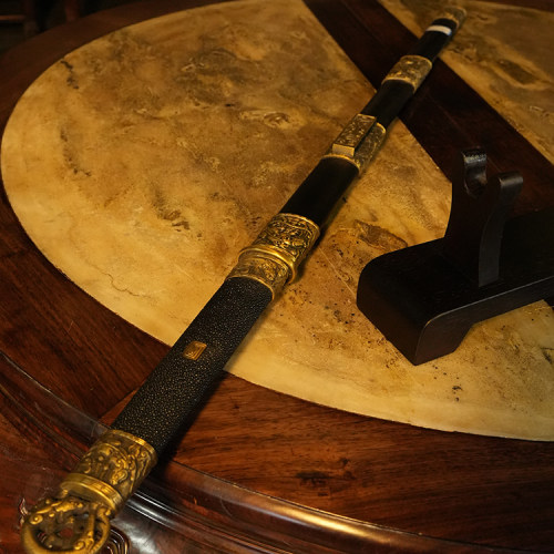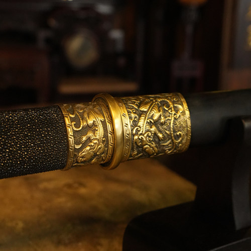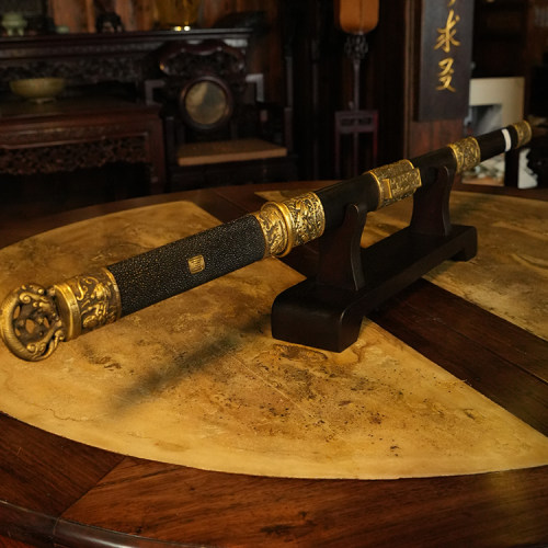 材质:古法自炼百炼钢剑身 ,黄铜装质地、手工雕外装,上等黑檀木剑鞘