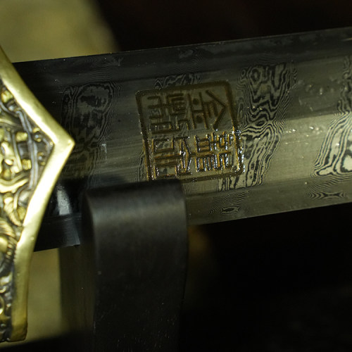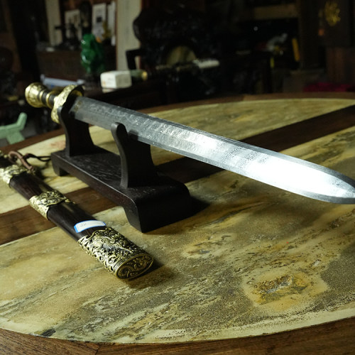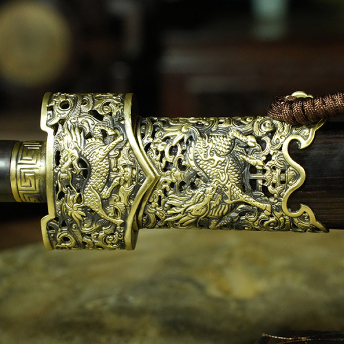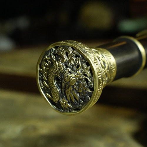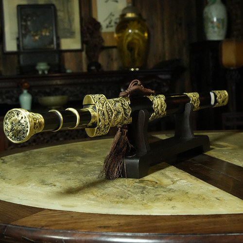 材质:古法锻制自炼百炼钢剑身,黄铜装质地、手工雕外装,上等黑檀木剑鞘