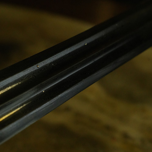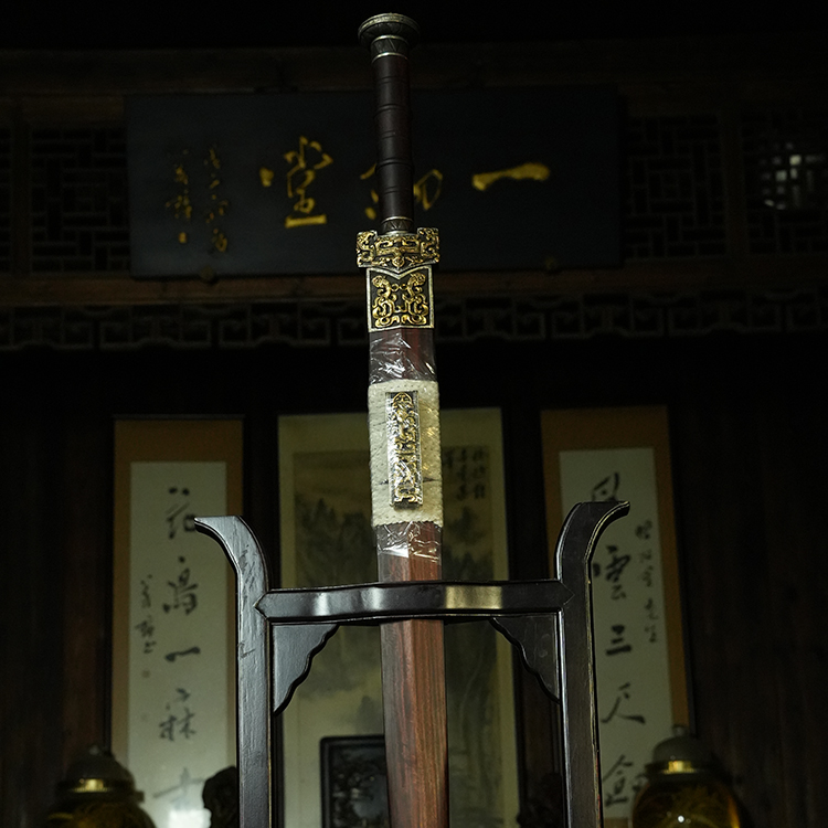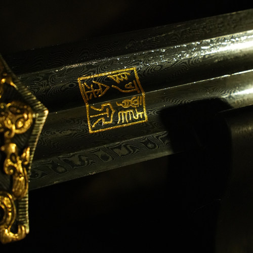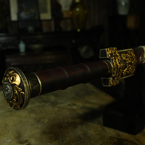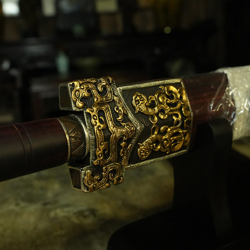 材质:古法锻制自炼百炼钢剑身,铜底鎏金银外装,上等血檀木鞘
