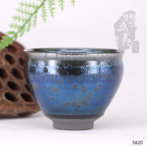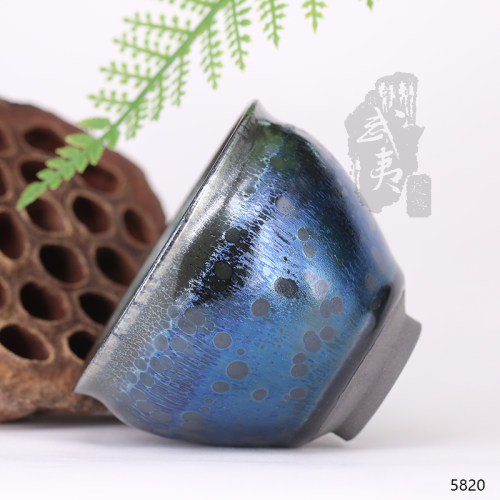 这只的外壁颜色与盏内里的颜色一致,不会像有的盏,内里颜色好看,外壁不够好,或者是外壁颜色好看,内里颜色不够精彩。这只是里外一致,都是深邃的蓝色,而且泛出明显的曜彩,在自然光下,耀耀生辉,像极了浩瀚宇宙里的星空!